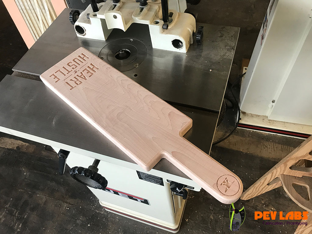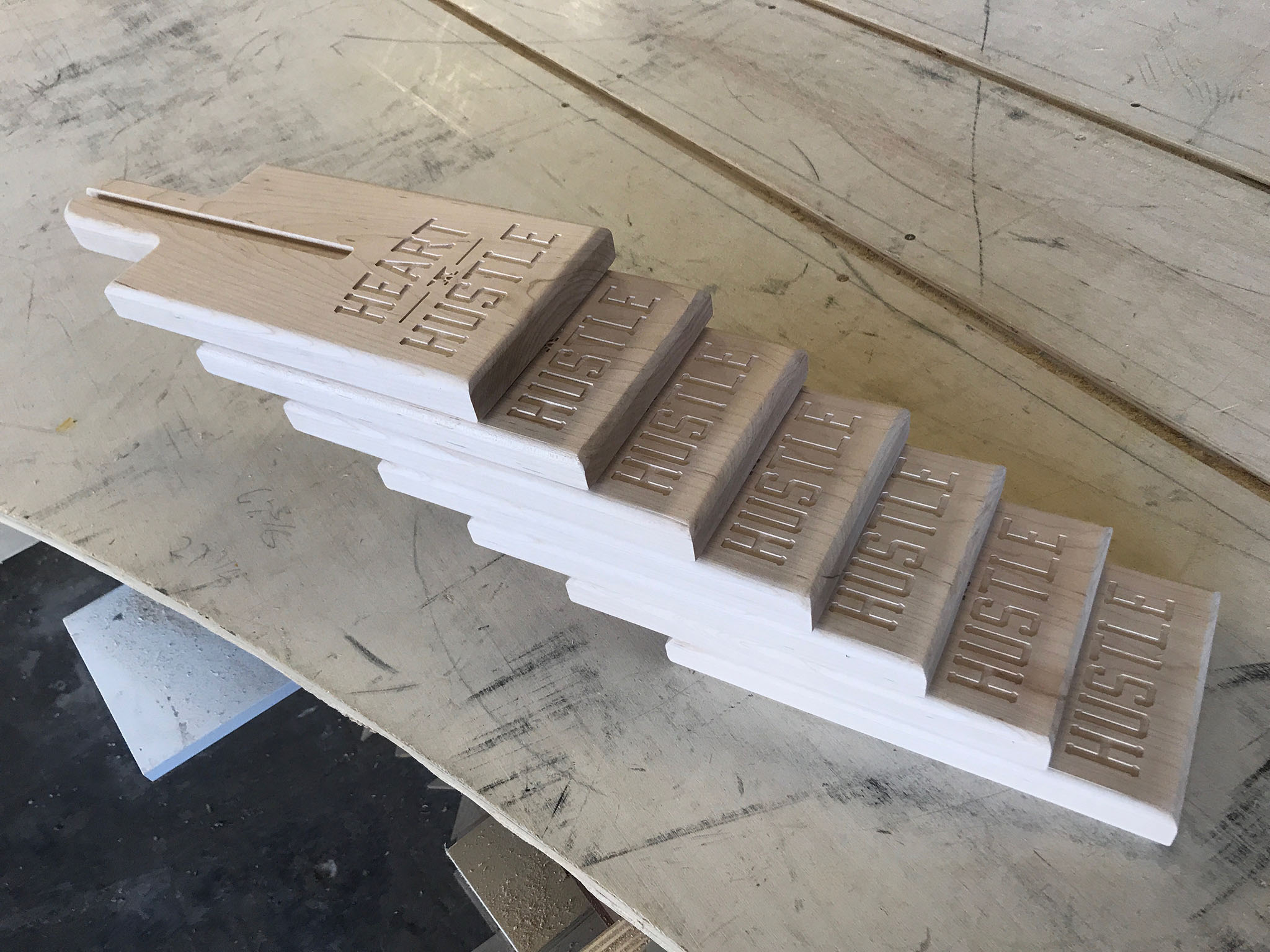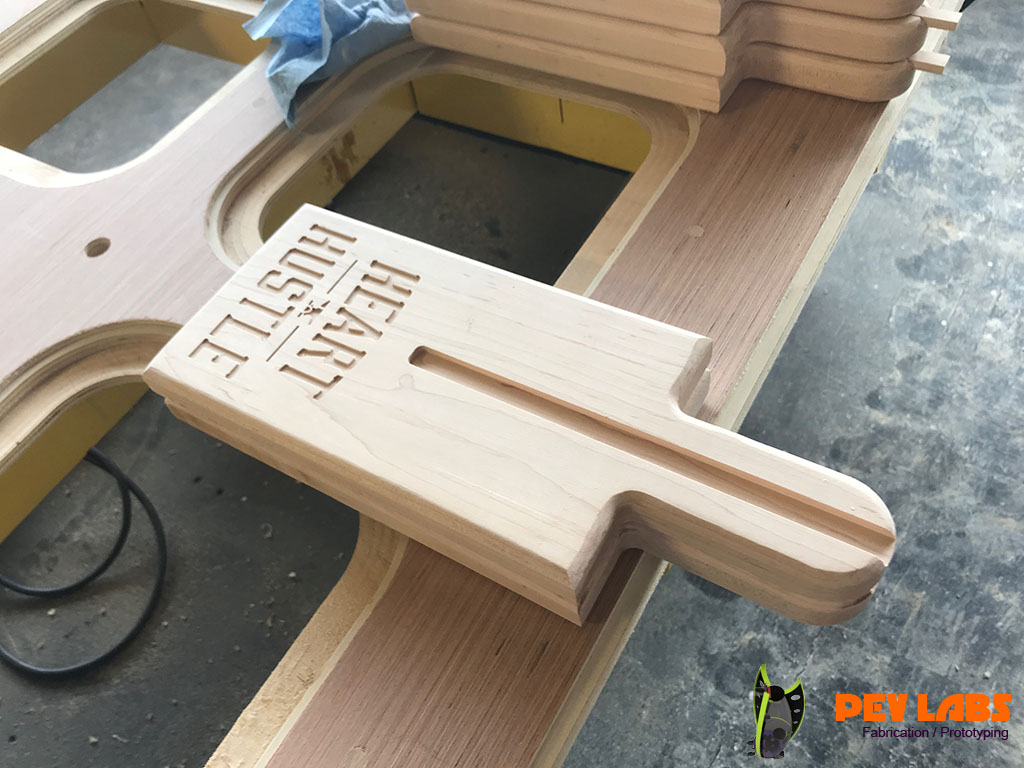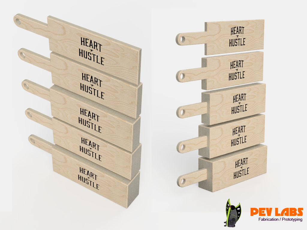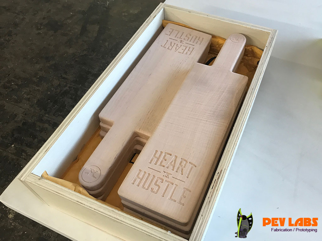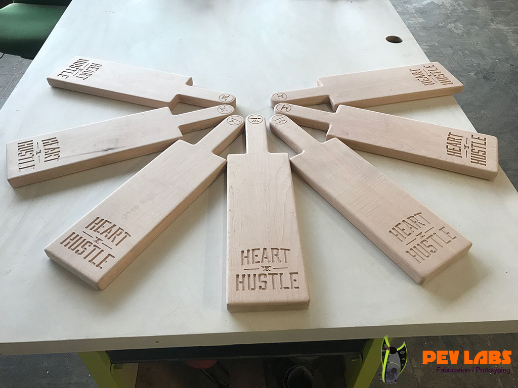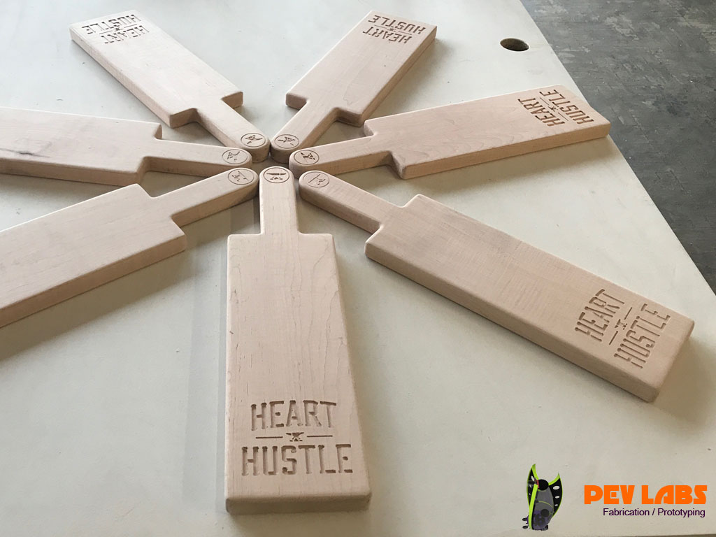 We designed and produced a few production runs of these Weightlifting Press Boards for Heart and Hustle Gym in Los Angles, CA. Project includes Product Design, CNC Milling, CNC Engraving and general Woodworking. These are made of solid hard maple grown and harvested from the eastern side of the United States. The way board presses are used in weightlifting is by Layering seven of the one inch thick boards on top each other during powerlifting training. After a set of reps are complete by the weight lifter one board is removed by the trainer which offers a new one inch lower sticking point. This is repeated until down to one of the boards. The power lifter will start with a full set of lumber between the barbell handle and the chest, working their way way down to one inch between the two. Bench Press Boards allows the lifter to focus on the lockout portion of the lift. The traditional press board method is to glue up five sets of blocks at one inch intervals. This method reduces cost by reducing material significantly and labor modestly. On the second iteration of this product we added the spine and groove to help guide the boards, or to keep them from sliding sideways. If you are in need of branded product production please reach out.