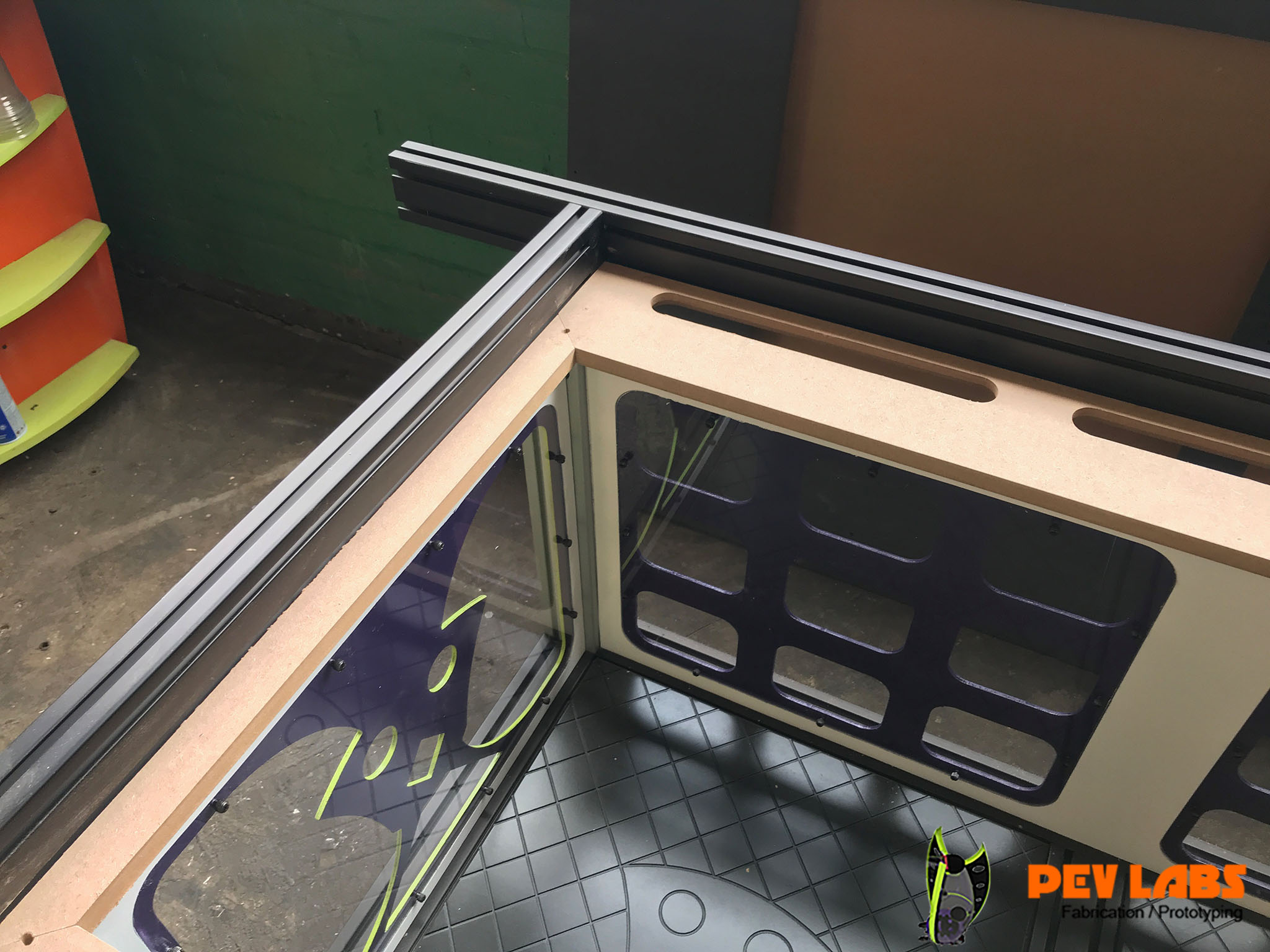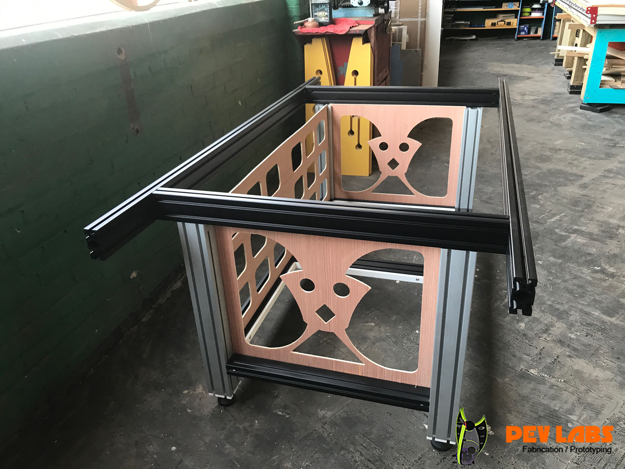 This DIY Laser Engraver project base cabinet will house some of the electronics and cooling system for the laser chassis that will sit a top. Custom shell panels shell are set in the frame grooves which is made of extruded aluminum. Panels of color cored MDF, Luan plywood and polycarbonate. We started in CAD by producing 3D renders from our 3D modeling program, Fusiion360. This DIY Laser Engraver project base frame is utilizing extruded aluminum stock with a mixture of natural and anodized black for a particular aesthetic what we like. The laser base cabinet has polycarbonate wall material inset in a uniquely designed framing support. The framing panels slide into the T-slot tracks prior to fastening the base top. The clear plastic panels can be removed at any time for servicing or expansion. Window panels are secured with anodized knurled thumbscrews. Floor panels have a unique CNC milled pattern and logo engraved which also matches the side branding.