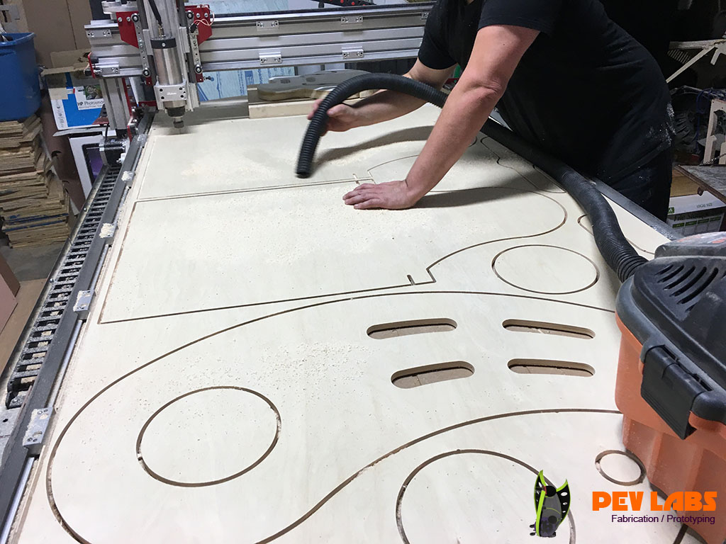 This is a projector stand designed and fabricated for a hanging projector at Tinkersmiths Makerspace in Charlottesville Virginia to show movies an and workshop lessons. Designed in AutoDesk Fusion 360 and Milled on our Gantry CNC this is another example of our Flat-Pack designs that can be assembled and finished by the end user. Manufactured from finish grade half inch plywood this unit assembles in minutes with just a few standard drywall screws. The projector was fairy so mounting that was the only part that took a little caution. Designing plywood furnishes goes quickly which results in an affordable custom home furnishing or business storage solution. This version is hanging from the metal trusses in the warehouse ceiling, but we could adapt the design for office or residential use if desired.