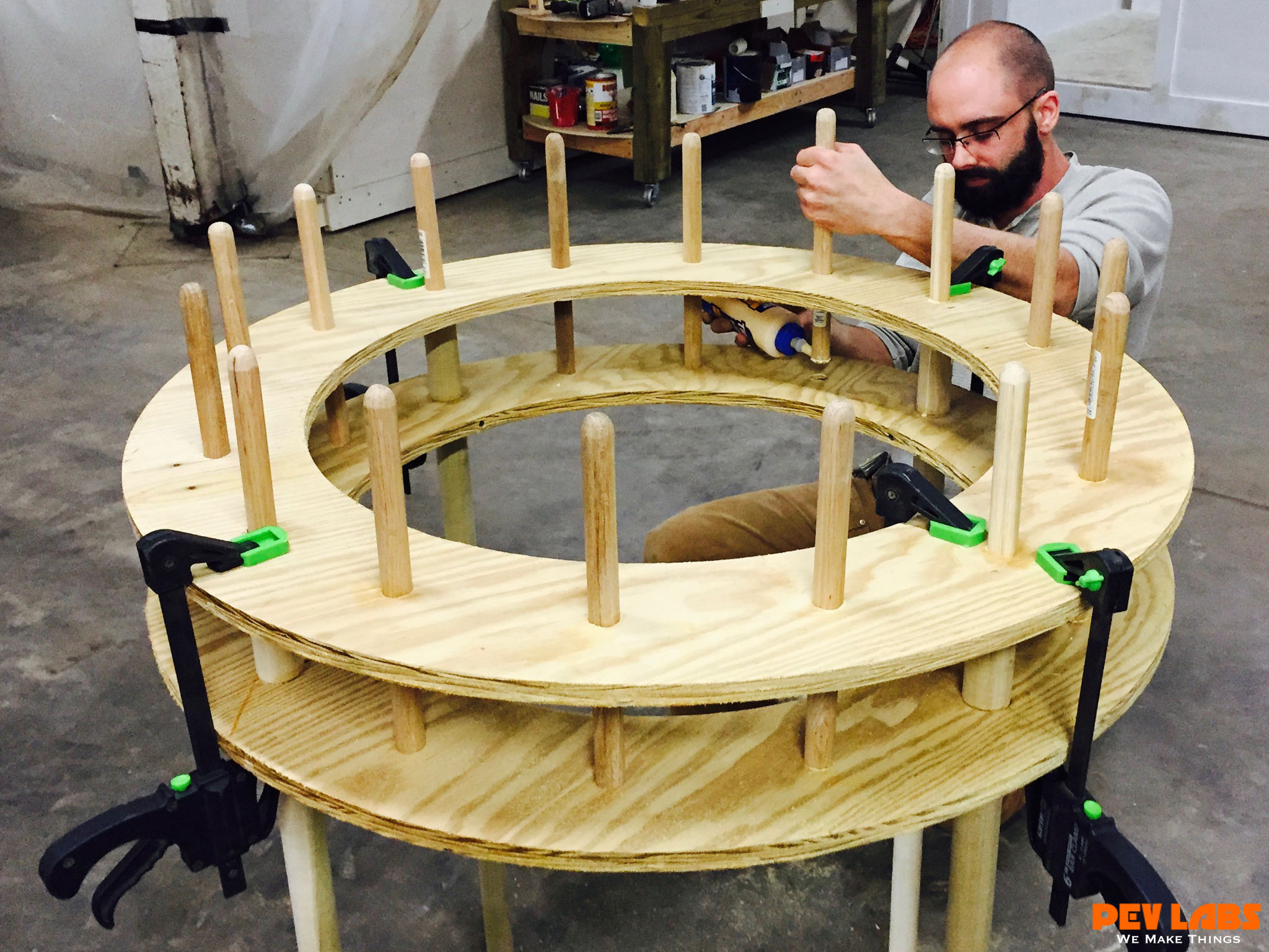 We manufactured this very large DIY Knitting Nancy for a project at the IX Art Park in Charlottesville Virginia. As the park attendees weave more rope tubing large balls are inserted and becomes an unusual park bench. Part of a larger immersive art experience. Our view is art can be more of an on-demand participatory experience rather than just an observation from a viewer. Or to say this device is more for art creators than art consumers. Most Knitting Nancy's are small hand held devices. The one we built is dozens of times larger than the norm. Therefore the knitted results are substantially larger. Unfortunately we did not get any pictures of the resulting woven benches. There are other examples of this online which can be found with a simple web search. This was produced CNC milling the plywood rings with dowel holes. Then driving large dowels, maybe clothing rods with rounded top ends. though the holes.