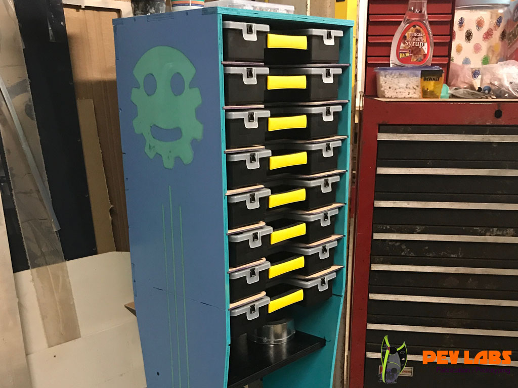 Custom designed for use in our own shop, this flat-pack parts organizer project also can double as bench legs. Made from half inch cabinet grade pre-primed plywood. We CNC milled in dado slots for quarter inch tray separators made of .22" thick Luan plywood. Luan ply is mostly used for vinyl flooring underpayment. Lowes sheet stock is a very attractive and affordable material. The logo was inset with silicon rubber. We keep all our nuts, bolts and doodads and whatnots in these. Unit pops together with a rubber mallet and a few drywall screws. This is a flatpack system which can be assembled easily. Designed to utilize standard hardware store plastic parts trays. Unit is using Stanley SortMaster Junior 14 Compartment Small Parts Organizer. Many of these parts trays are similar sizes so a few other brands or models would probably fit.