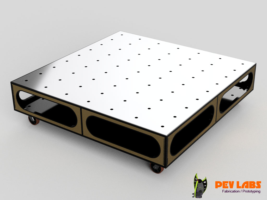 Ron Paulk designed a portable workbench 40 years ago that has been copied countless of times by carpenters, woodworkers and shop enthusiast and still very popular today. Though the original concept was to have a large work surface break down into something that could be transported daily by a tradesman to a job site many adaptions have forked off this over the years into more stationary workshop surfaces. Design offers a ridged work surface that will span over minimal support points much like our bridge concept in our flat pack furniture line. Work surface is most often perforated with standard 3/4" bench dog holes. Our adaptions is a 46" x 46" Paulk style bench top on casters used with various accessories as a materials pallet. Can easily roll on the wheels or be loaded into a freight vehicle by forklift. We can produce these with any measurements you need.